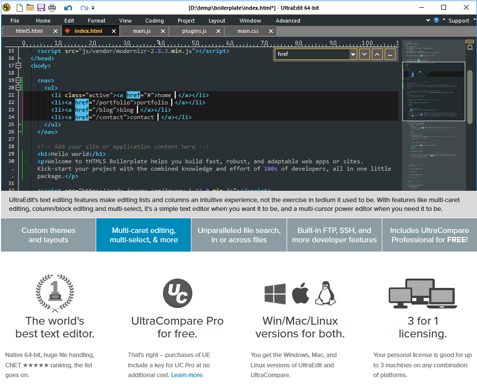 UltraEdit ist ein Code-Entwickler, mit dem Sie Codes schreiben, bearbeiten und verwalten können. Diese Applikation ähnelt wohl eher einer Programmiersoftware als einer gewöhnlichen Editor-App. So können Sie mit ihr textbasierte Dateien, wie HTML oder JavaScript bearbeiten und Quellcodes, wie C,C++ oder Java öffnen. Außerdem haben Sie die Möglichkeit, auf einen integrierten FTP-Client zuzugreifen.