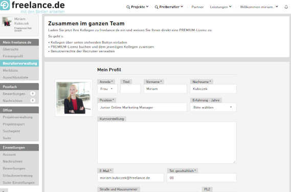 Jeder Recruiter bekommt einen eigenen Zugang für die freelance.de Plattform. So kann jeder Recruiter ausgeschriebene Projekte und eingehende Bewerbungen eigenständig verwalten. Da alle Recruiter unter einem Dach-Account miteinander verbunden sind, können Informationen auch untereinander ausgetauscht werden.