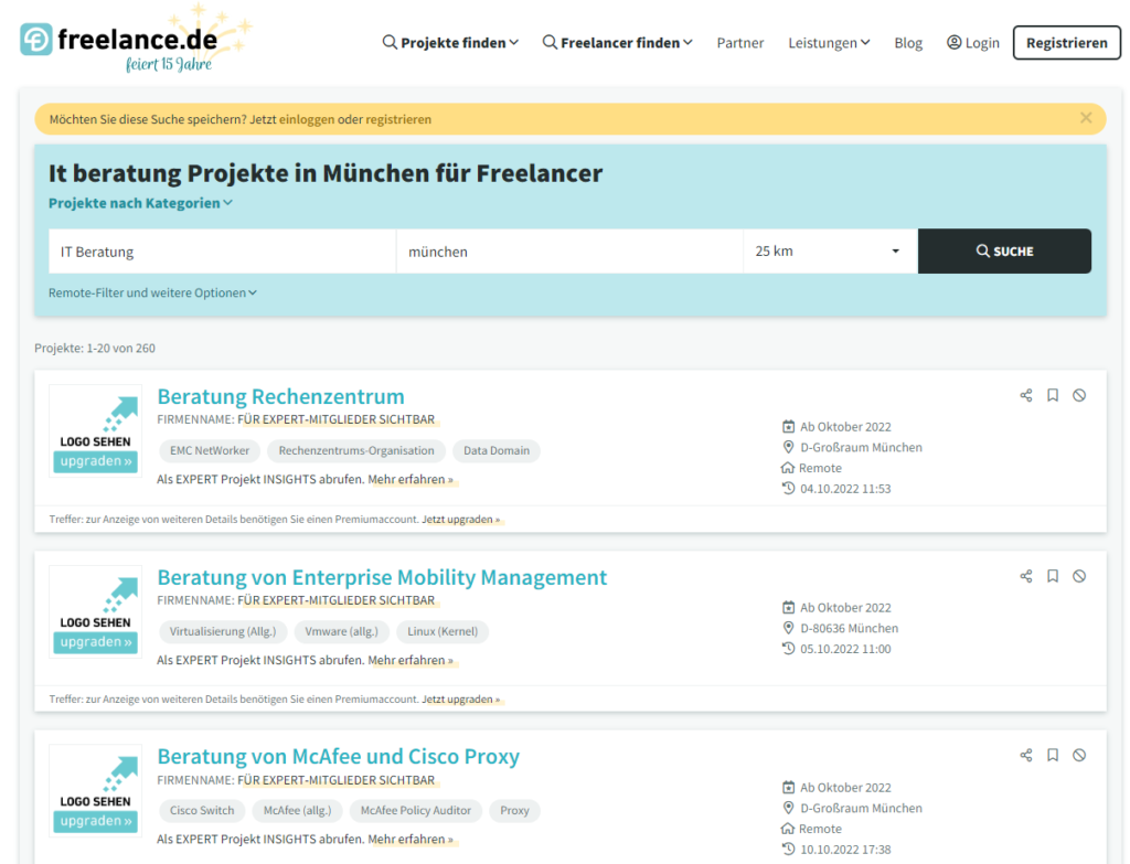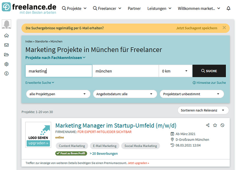Mit einer EXPERT-Mitgliedschaft können Sie bis zu zehn Suchagenten einrichten. Zudem können Sie Ihre Suche genauer eingrenzen und Projektangebote noch gezielter filtern.