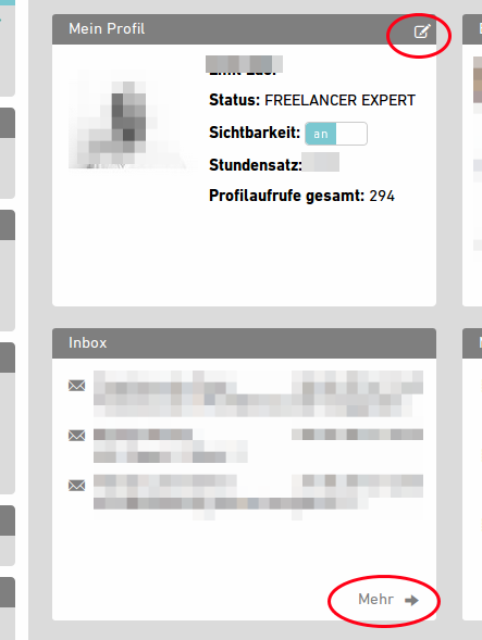 - Freelancern wird unmittelbar der Sichtbarkeitsstatus Ihres Profils dargestellt, erkennbar an einem grünen (=sichtbar) oder roten Auge (= nicht sichtbar)