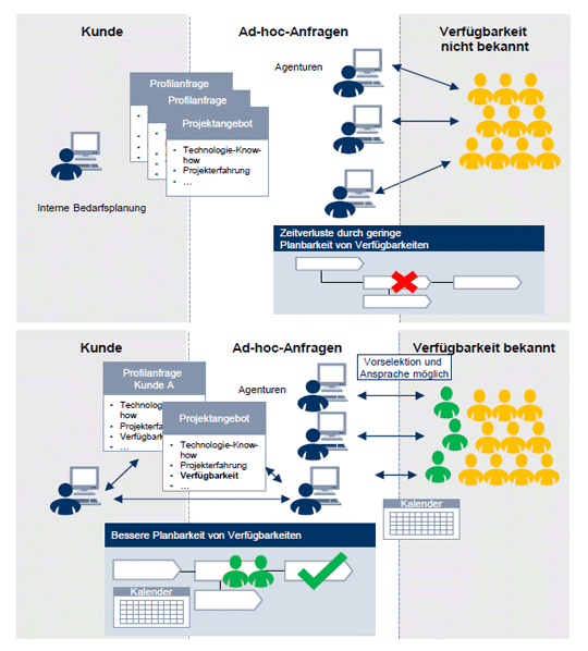 Da nicht zu erwarten ist, dass sich die Projektbudgetierungs- und Vergabepraxis in den großen Unternehmen mittelfristig ändert und damit seitens der Projektanbieter eine bessere Planbarkeit möglich wird, liegt die Chance zur besseren Verfügbarkeitstransparenz fast ausschließlich bei den IT-Freelancern. Über die Projektportale ist die Sichtbarkeit der eigenen Verfügbarkeit gut zu steuern und es bietet sich die Chance, die Anschlussprojekte besser planen und realisieren zu können.